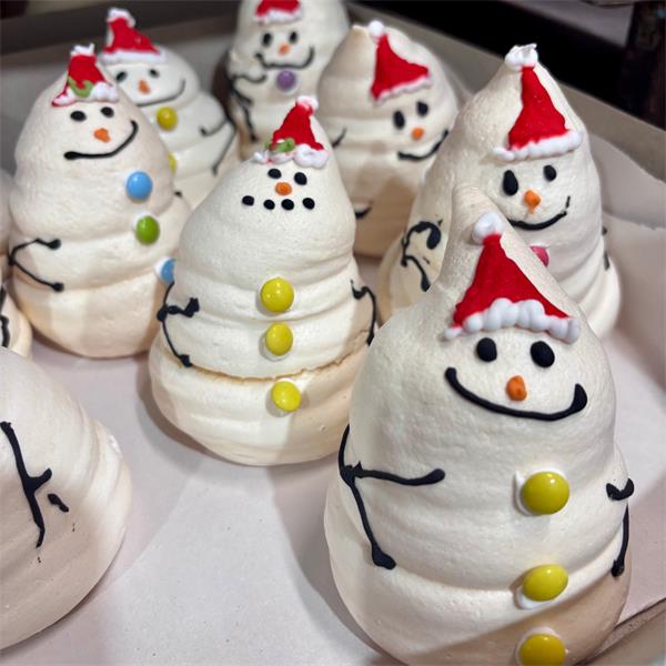 A light and sweet meringue which is soft and chewy, partly coated with chocolate and decorations. An ideal treat for the kids at Christmas